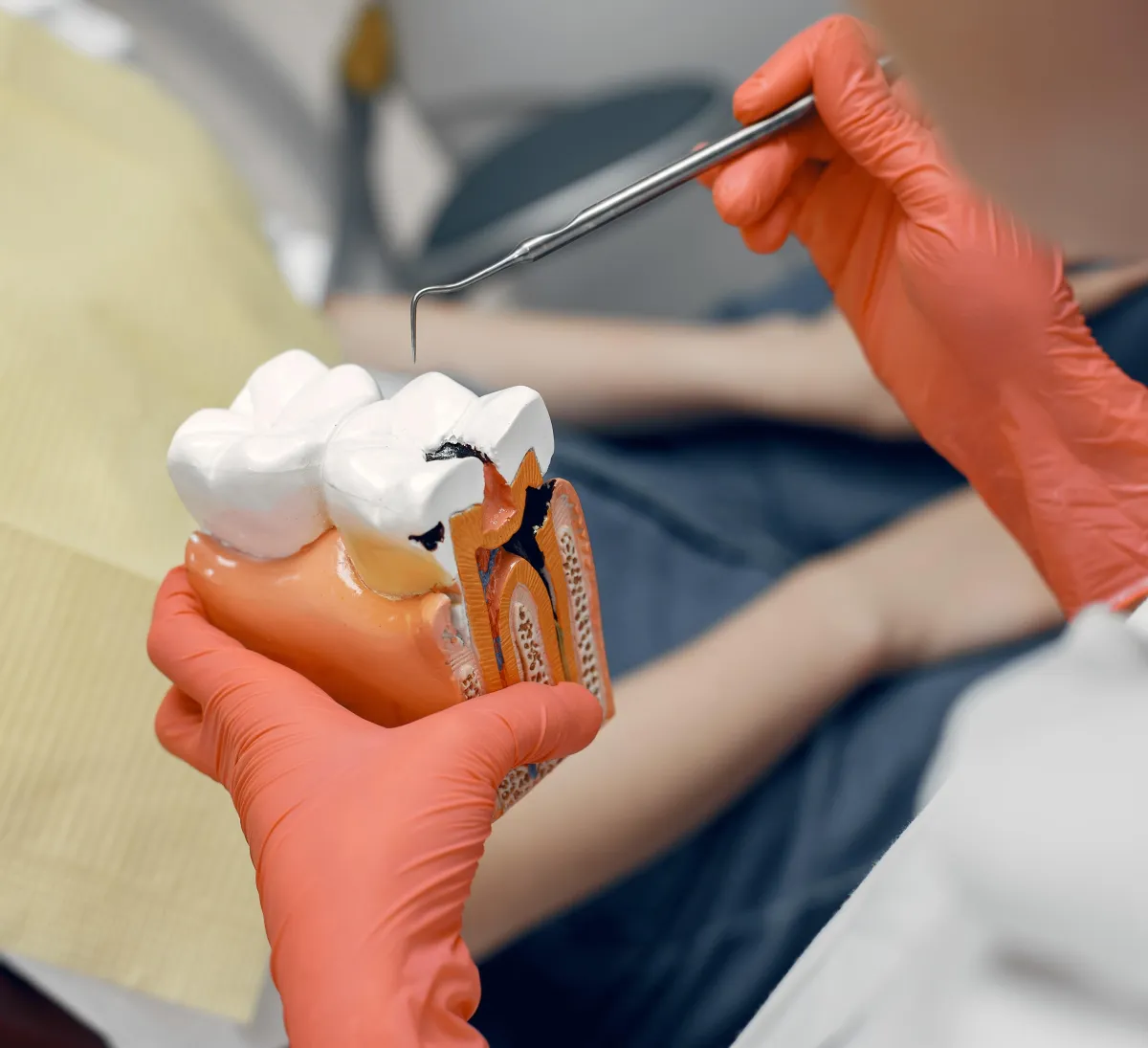 Mit modernen, zahnfarbenen Materialien wie Komposit oder Keramik lassen sich kariöse Defekte unauffällig und langlebig versorgen.